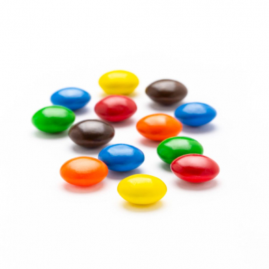 Dark chocolate buttons covered in crisp, colorful candy shells.