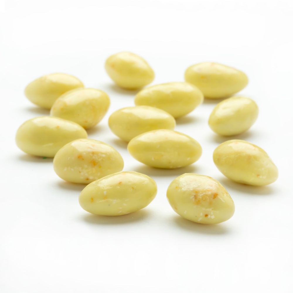 Roasted almonds covered in white chocolate and sprinkled with toasted coconut.