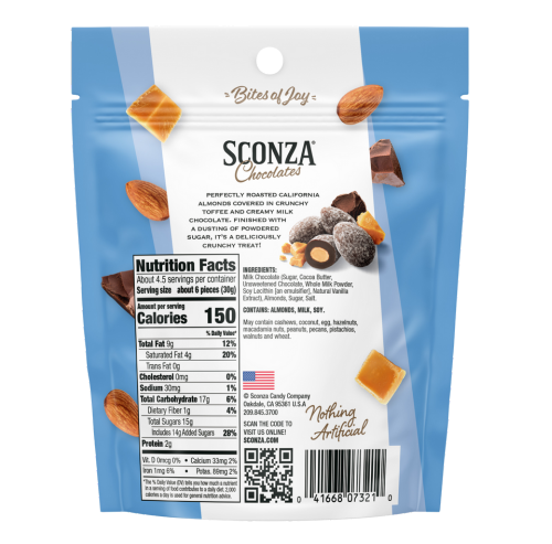 Perfectly roasted California almonds covered in crunchy toffee and creamy milk chocolate. Finished with a dusting of powdered sugar for a deliciously crunchy treat! Contains Nothing Artificial.