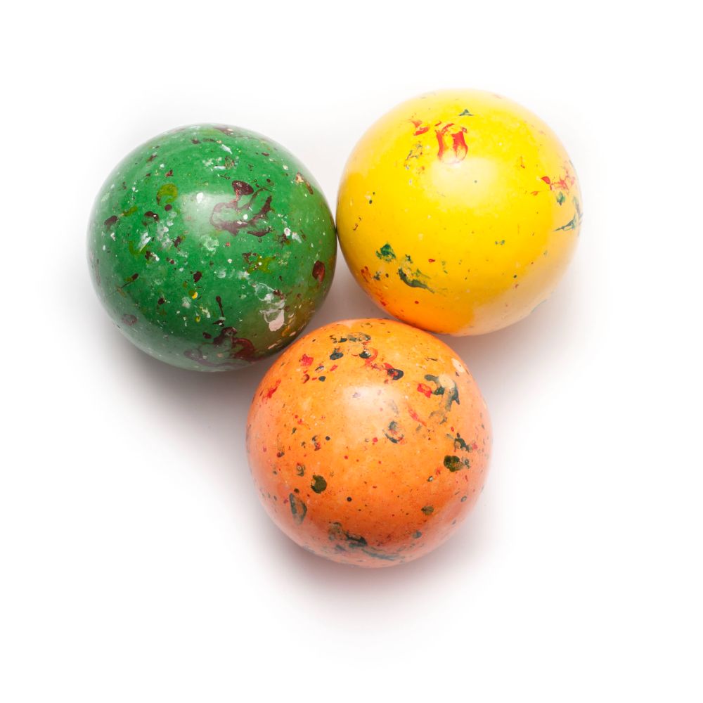 Sugary rainbow colors on these giant jawbreakers.